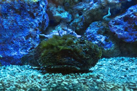 Black Stonefish by coral reef in aquarium. Black synanceia verrucosa fish