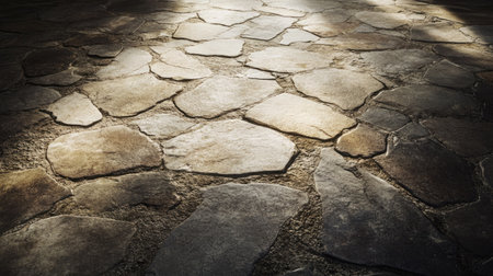 Sunlight illuminates an irregular stone paving, creating a rustic and textured pathway with varying shapes and sizes of stones, adding character to an outdoor space