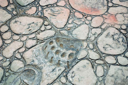 Background top view close up of cobblestones of various colors from a street in Colombia.