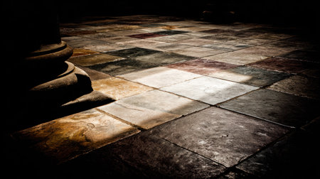 View of an old, checkered floor made of large, varied stone tiles, with one side strongly shadowed by the base of a large column, while a sharp beam of sunlight cuts across the center, highlighting the different colors and textures of the aged stone squares.