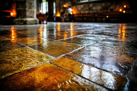 Close-up view of a meticulously crafted, tiled floor. The tiles are various shades of brown, yellow, and orange, creating a rich mosaic effect. Reflections of light are prominent on the polished surface, highlighting the intricate details and patterns within the design. The image captures the historical and architectural significance of the floor.