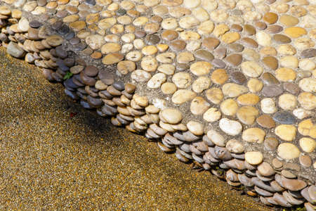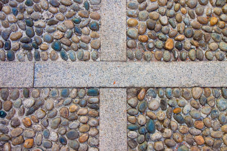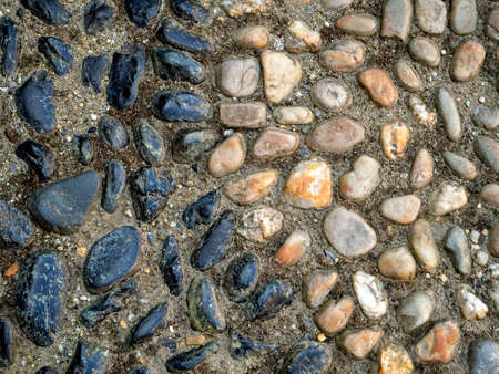Vintage nature cobblestone and pebbles pavement in disorganized arrangement pattern background. Paving blocks made of nature asymmetrical stone background.