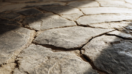 This outdoor pathway features a close up view of rough uneven stone tiles scattered across the ground illuminated by the warm glow of the late afternoon sun. The stones vary in size and texture showcasing natural colors ranging from beige to gray with some exhibiting subtle striations. The interplay of light and shadows accentuates the rugged edges creating an organic aesthetic that suggests a rustic charm