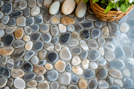 Polished riverbed rocks creating a decorative surface, accompanied by smooth stones and a plant in a wicker basket