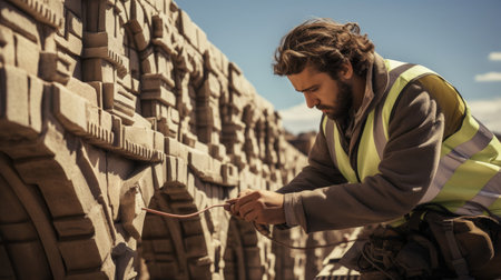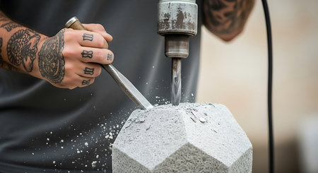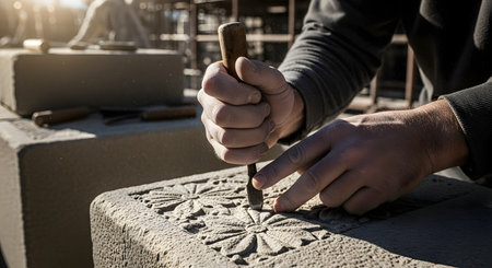 A close-up of a stonemason's hands using a chisel and mallet to skillfully carve an intricate floral pattern into a large block of stone. Dust flies as the craftsman meticulously works, showcasing traditional techniques and artistry. This image embodies skill, craftsmanship, and heritage.