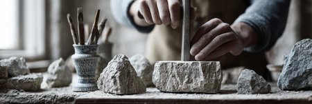 Skilled artisan meticulously carves stone in a rustic workshop, surrounded by various tools, dust, and rock fragments in natural light.