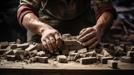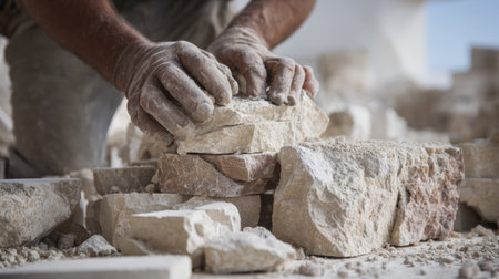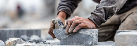 Close-up view of hands carefully working with tiles, likely during a construction project. The image highlights hands manipulating stone or ceramic pieces, surrounded by similar building materials, creating an artistic composition. Suitable for visual concepts related to building, repair, or illustrating home improvement practices, it may be used in commercial and editorial projects.