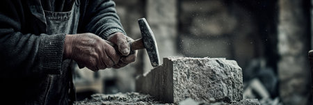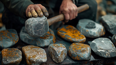 In a cloud of dust and debris, a skilled craftsman's weathered hands bring immense force down, striking a stone with a heavy hammer.
