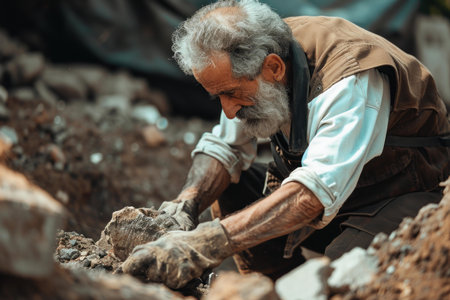 Senior man with a gray beard meticulously works with soil, showcasing the value of hard work