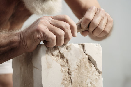 With focused intensity, a master craftsman's weathered hands guide a chisel through rough stone.