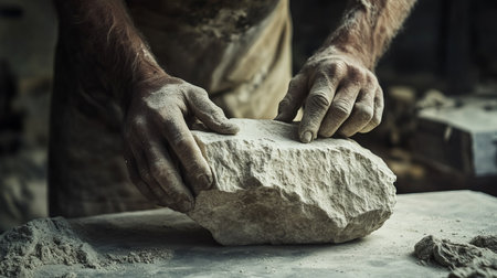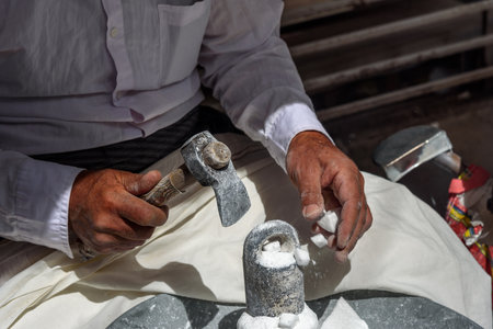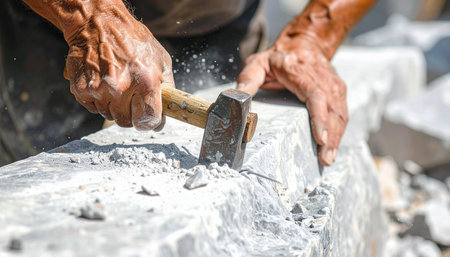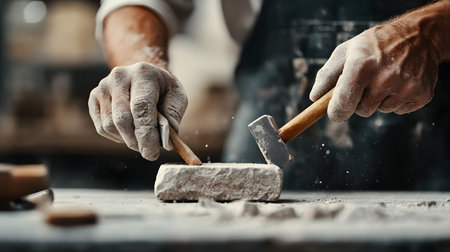 With focused intensity, the weathered hands of a master artisan strike a block of stone, sending chips flying.