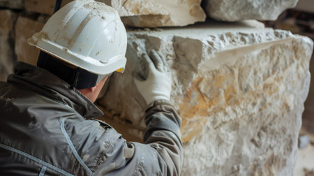 A construction worker in a hard hat and gloves is chiseling a stone block in a stone quarry. The worker is focused on the task at hand.