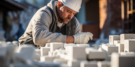 Male builder, Industrial bricklayer installing bricks on a construction site, Generative AI