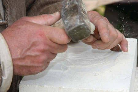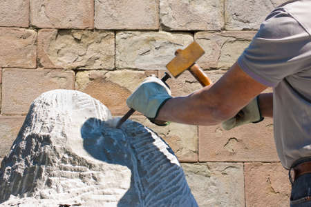 Stone carver works with wooden hammer and chisel at limestone.