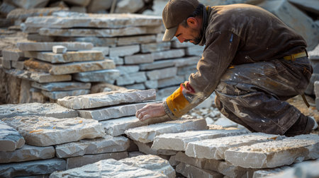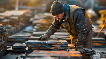 A worker in a jacket and hat carefully arranging slate stones in an outdoor construction site with sunlight