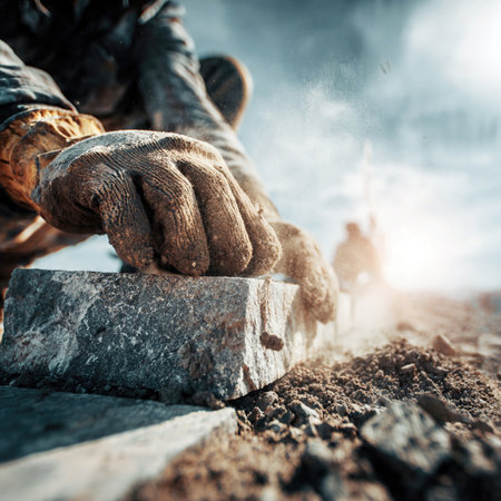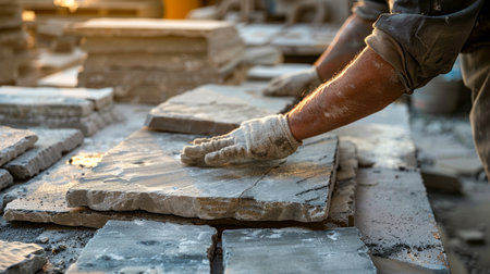 A construction worker's hands placing stone tiles carefully, focusing on precise and skillful craftsmanship