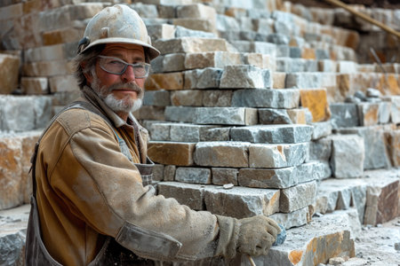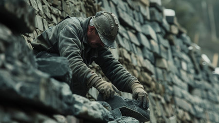 Stone mason carefully placing stones while building a wall, showcasing craftsmanship and skill