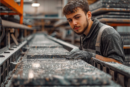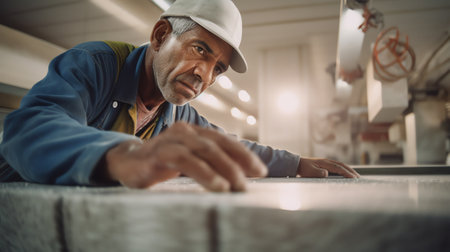 Generative AI a man in work clothes and gloves polishes a marble stone with an angle grinder. grinding stone. manufacturing of monuments. marble slab