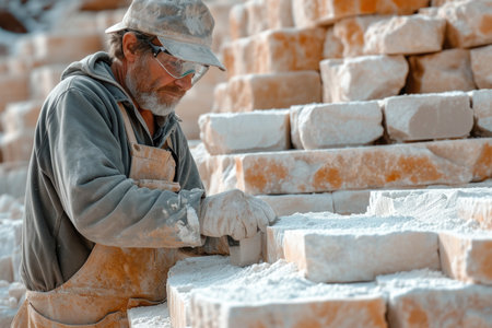 Artisan expertly chisels blocks of stone in a workshop, showing detailed craftsmanship and focused concentration while creating a sculpture.