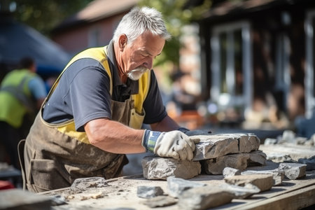 Close up of senior caucasian man working with stone on construction site