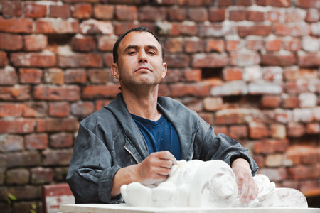 Craftsman working with gypsum model in fair