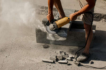 The process of laying sidewalk curb. A worker cuts a concrete block with a circular saw. A lot of dust.