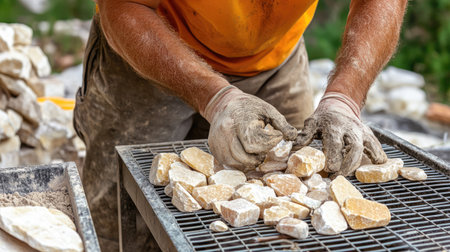 A skilled artisan carefully sorts through natural stones in an outdoor setting, demonstrating meticulous craftsmanship and dedication to the construction craft.