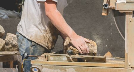 man cutting a stone with a water saw on a renovation site