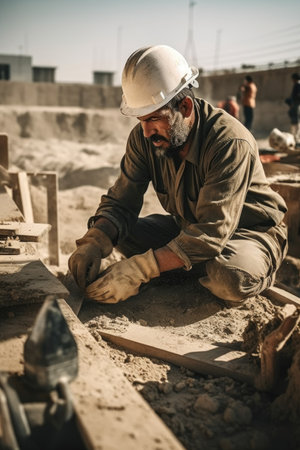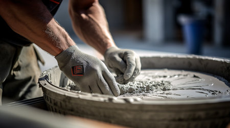 A diligent worker is smoothing wet concrete at a construction site under natural light. Hard work is evident on his focused face and hands.
