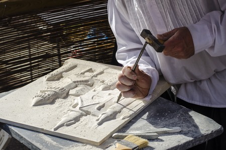 old craftsman Mason during the processing of a piece of white marble