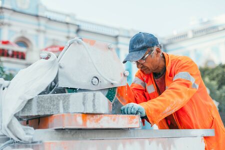 Moscow, Russia - August 14, 2015: a builder cuts a piece of granite stone on a circular saw machine. Reconstruction of pavement tiles in the capital near palace Chertkov House. Myasnitskaya street