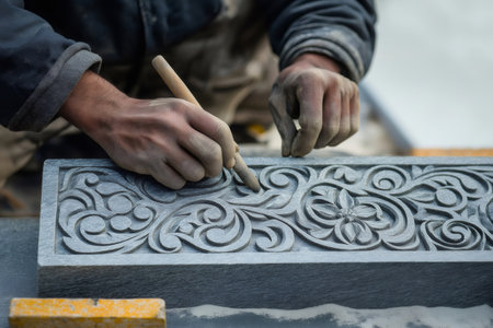 Close up of stonemason's hands meticulously carving intricate floral patterns into a granite block, demonstrating craftsmanship and artistry in stonework