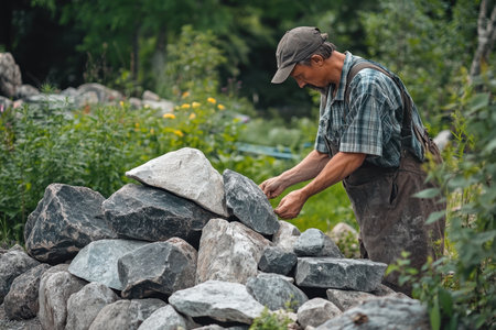 A man builds a sturdy stone wall in a lush garden, carefully arranging rocks under sunlight.