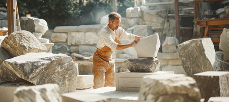 Stonemason working with stone block in open air workshop