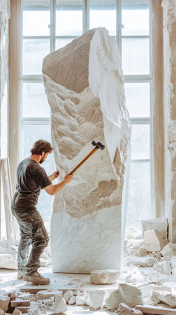 A sculptor is shaping a statue using a hammer and chisel surrounded by flying stone dust. The artistic atmosphere highlights the creativity and craftsmanship involved in sculpting.