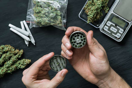 grinder in hand with fresh marijuana, Cannabis buds on black table, rolled joint with weed, close up,
