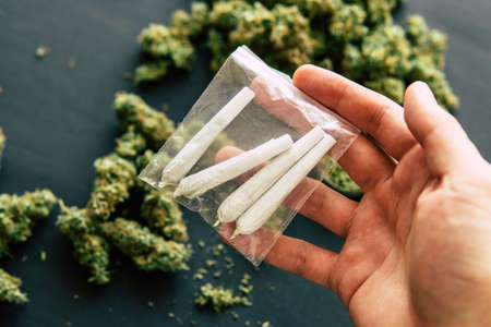 Marijuana blunt in hand. Smoking cannabis at home. THC and CBD medical use.
