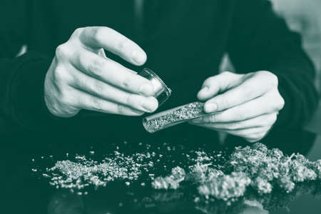 A drug dealer weighs cannabis flower marijuana on a scales concept of legalizing herbs weed close up