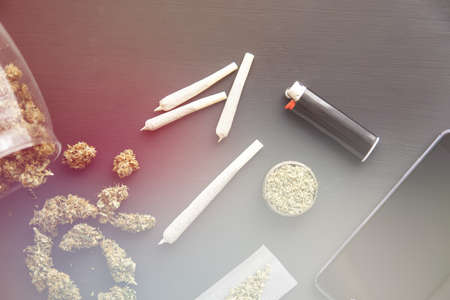 Smartphone and Marijuana Cannabis buds in the package on the table and joint on table in a moody green tone horizontal
