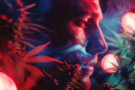 In a captivating display of light, a man stands amidst cannabis plants, illuminated by colorful lights that enhance the surreal ambiance of the night.