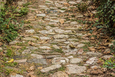 Old cobblestone road in the forest, selective focus on the stones