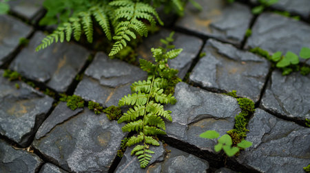 green fern growing on the stone path in the garden, stock photo