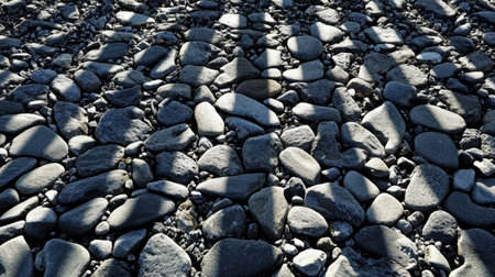 A captivating view of a pebbled surface, showcasing a mix of dark and light stones cast under shadows, ideal for enhancing various design projects or nature-focused themes.