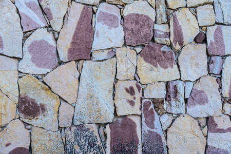 Colorful dark wet stone wall. Texture of painted granite. Uneven rock surface of floor, decorative tile of facade building. Purple, red and grey mosaic pattern of stones, cement