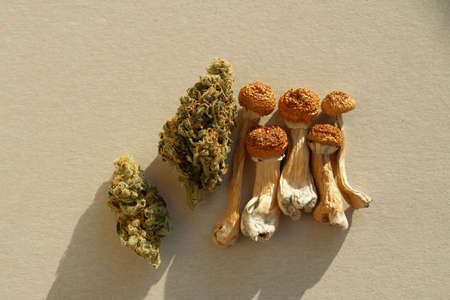 Layout of dried psilocybe mushrooms and marijuana buds on ivory background. Psychedelic trip, CBD recreation. Micro-dosing concept.