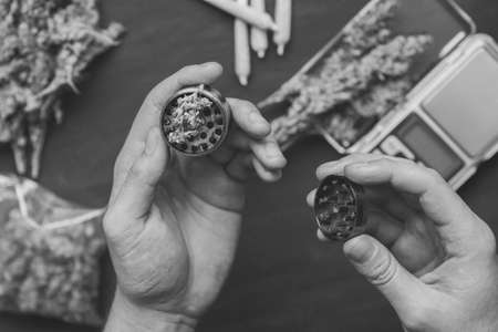 Close up of marijuana blunt with grinder. Cannabis use concept. Preparing and rolling marijuana cannabis joint. Rolling a marijuana joint.