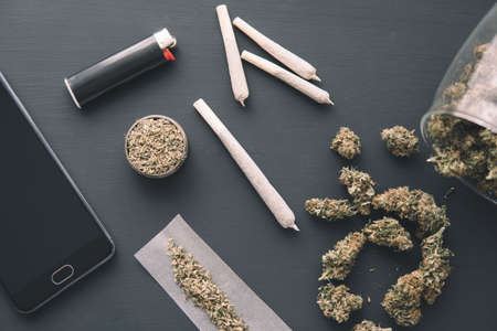 medicinal marijuana with medical use. Flatlay cigarettes with grass, a lighter, a phonendoscope, a bottle for drugs