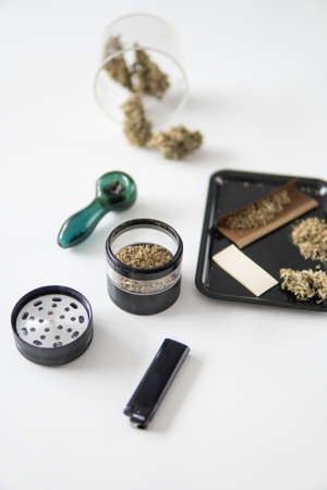 still life marijuana sunglasses, lighter, pack of hemp and smoking pipe on white table.