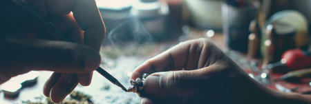 Close up of addict lighting up marijuana joint with lighter. Man rolling a marijuana weed blunt. Man preparing and rolling marijuana cannabis joint. light licks color toned