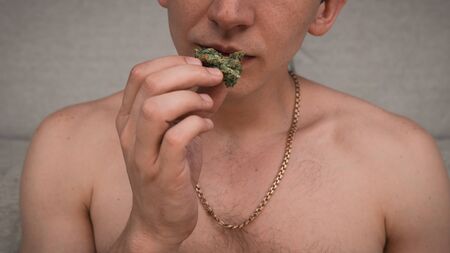 The young person are holding medical marijuana buds in his hand. Cannabis is a concept of herbal medicine. Marijuana is medicine